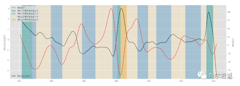 plt.legend(loc='lower left' ) ax1.set_ylabel('剩余流动性因子' ) ax2=ax1.twinx() plt.plot(data['通胀因子' ],label='通胀因子' ) ax2.set_ylabel('通胀因子' ) plt.legend() dd=dd.dropna() con1=0 con2=0 con3=0 con4=0 for i in dd.index: if dd.loc[i,'剩余流动性因子_上行概率' ]<0.5 and dd.loc[i,'通胀因子_上行概率' ]<0.5 : num=list (dd.index).index(i)+1 plt.axvspan(i,list (dd.index)[num],label="_" *con1+"通胀下行剩余流动性下行" ,alpha=0.3 ) plt.legend() con1=con1+1 if dd.loc[i,'剩余流动性因子_上行概率' ]>0.5 and dd.loc[i,'通胀因子_上行概率' ]<0.5 : num=list (dd.index).index(i)+1 plt.axvspan(i,list (dd.index)[num],label="_" *con2+"通胀下行剩余流动性上行" ,color='darkcyan' ,alpha=0.3 ) plt.legend() con2=con2+1 if dd.loc[i,'剩余流动性因子_上行概率' ]<0.5 and dd.loc[i,'通胀因子_上行概率' ]>0.5 : try : num=list (dd.index).index(i)+1 plt.axvspan(i,list (dd.index)[num],label="_" *con3+"通胀上行剩余流动性下行" ,color='moccasin' ,alpha=0.3 ) except: print (i) con3=con3+1 if dd.loc[i,'剩余流动性因子_上行概率' ]>0.5 and dd.loc[i,'通胀因子_上行概率' ]>0.5 : try : num=list (dd.index).index(i)+1 plt.axvspan(i,list (dd.index)[num],label="_" *con4+"通胀上行剩余流动性上行" ,color='orange' ,alpha=0.3 ) con4=con4+1 except: print (i) plt.legend()