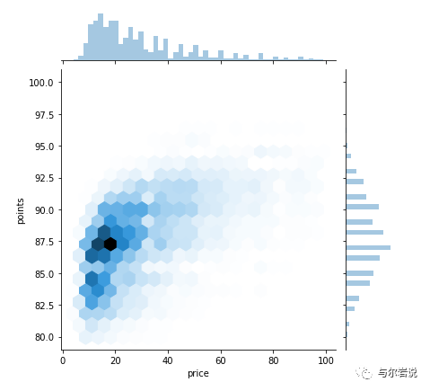 此图中的数据与之前散点图中的数据直接可比,但它告诉我们的故事却大不相同。从 这个六边形图中我们可以看到,Wine Magazine 评论的酒瓶聚集了大约 87.5 分和大约 20 美元。