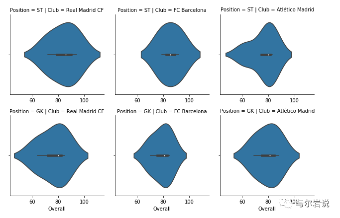 df = footballers[footballers['Position' ].isin(['ST' , 'GK' ])]df = df[df['Club' ].isin(['Real Madrid CF' , 'FC Barcelona' , 'Atlético Madrid' ])] g = sns.FacetGrid(df, row="Position" , col="Club" ) g.map(sns.violinplot, "Overall" )