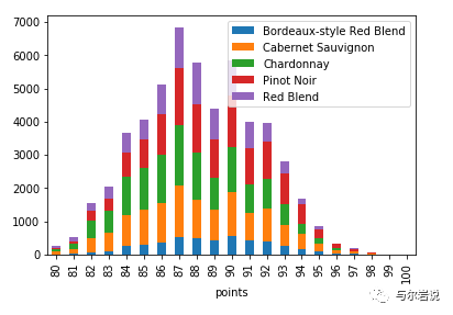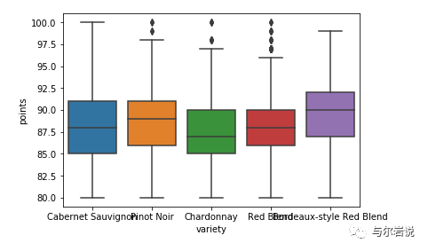 这个箱线图告诉我们,尽管所有五种葡萄酒的评分大致相同,波尔多风格的葡萄酒往往比霞多丽葡萄酒的评分高一点。
