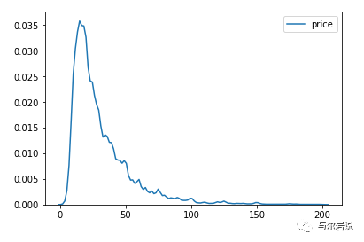 注意,xxais是seaborn,kdeplot是正在绘制的变量(在本例中是price),而y轴是它发生的频率。