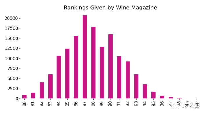 import matplotlib.pyplot as pltimport seaborn as snsax = reviews['points' ].value_counts().sort_index().plot.bar( figsize=(12 , 6 ), color='mediumvioletred' , fontsize=16 ) ax.set_title("Rankings Given by Wine Magazine" , fontsize=20 ) sns.despine(bottom=True , left=True )