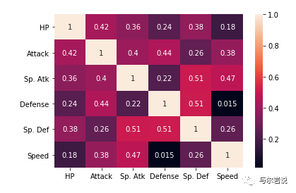 heatmap plot相关系数 sns.heatmap( pokemon.loc[:, ['HP' , 'Attack' , 'Sp. Atk' , 'Defense' , 'Sp. Def' , 'Speed' ]].corr(), annot=True )