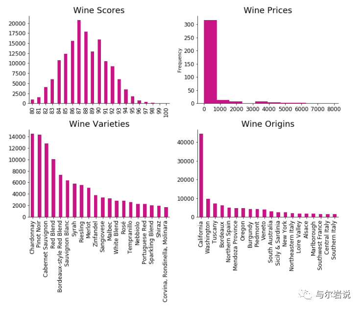 Subplot分图 fig, axarr = plt.subplots(2, 2, figsize=(12, 8)) reviews['points'].value_counts().sort_ index().plot.bar( ax=axarr[0][0], fontsize=12, color='mediumvioletred' ) axarr[0 ][0 ].set_title("Wine Scores", fontsize=18) reviews['variety'].value_counts().head(20).plot.bar( ax=axarr[1][0], fontsize=12, color='mediumvioletred' ) axarr[1 ][0 ].set_title("Wine Varieties", fontsize=18) reviews['province'].value_counts().head(20).plot.bar( ax=axarr[1][1], fontsize=12, color='mediumvioletred' ) axarr[1 ][1 ].set_title("Wine Origins", fontsize=18) reviews['price'].value_counts().plot.hist( ax=axarr[0][1], fontsize=12, color='mediumvioletred' ) axarr[0 ][1 ].set_title("Wine Prices", fontsize=18) plt.subplots_adjust(hspace=.3) import seaborn as sns sns.despine()