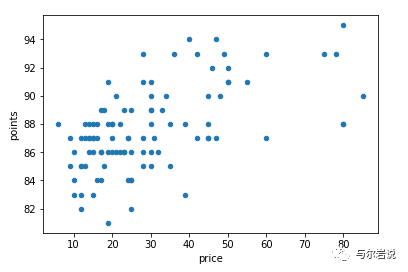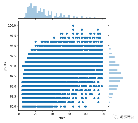 点状图 下图向 我们展示了价格和积分之间的相关性较弱 :也就是说,更昂贵的葡萄酒在评论时通常会获得更多积分。