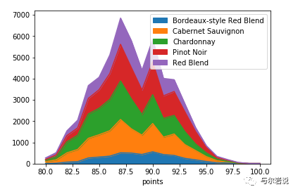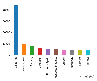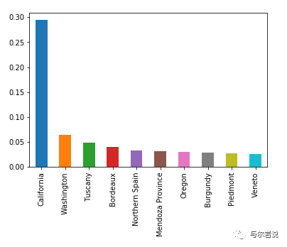 柱状图 首先使用pandas进行画图,观察数据结构,类别变量比较多,直接做一个柱状图,看到加利福尼亚产的红酒比其它所有区域都多,但是柱状图只能告诉绝对的数量,没办法告诉我们比例~