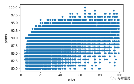 为了有效利用此图,我们必须对数据进行下采样,仅从完整集中抽取 100 个点。这是因为朴素的散点图不能有效地处理映射到同一地点的点。例如,如果两种葡萄酒(均价 100 美元)的评分为 90,则将第二个酒过度绘制到第一个上,我们只在图中添加一个点。 如果它只发生几次,这不是问题。但是有了足够多的点,分布开始看起来像一个无形的斑点,你只见树木不见森林: