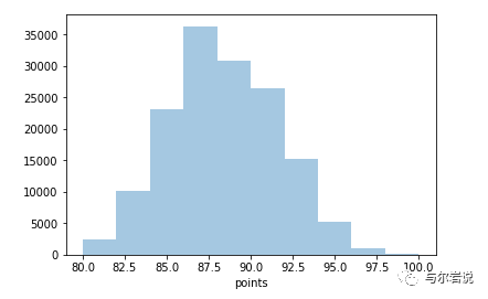 Distplot sns.distplot(reviews['points' ], bins=10 , kde=False )
