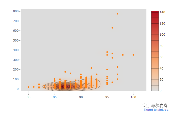 作为另一个例子,这里有一个KDE图(plotly称为historogram2dcontour)和相同数据的散点图。