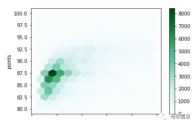 通过查看散点图,我们没有看到这种效果,因为太多价格相似、评分相似的葡萄酒被过度绘制了。通过解决这个问题,这个 hexplot 为我们提供了一个更有用的数据集视图。