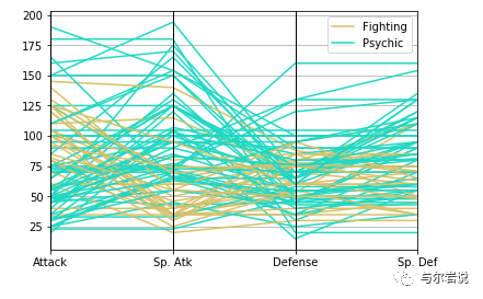 parallel_coordinates import pandas as pdfrom pandas.plotting import parallel_coordinatesp = (pokemon[(pokemon['Type 1' ].isin(["Psychic" , "Fighting" ]))] .loc[:, ['Type 1' , 'Attack' , 'Sp. Atk' , 'Defense' , 'Sp. Def' ]] ) parallel_coordinates(p, 'Type 1' )