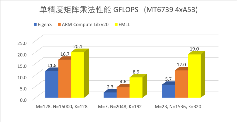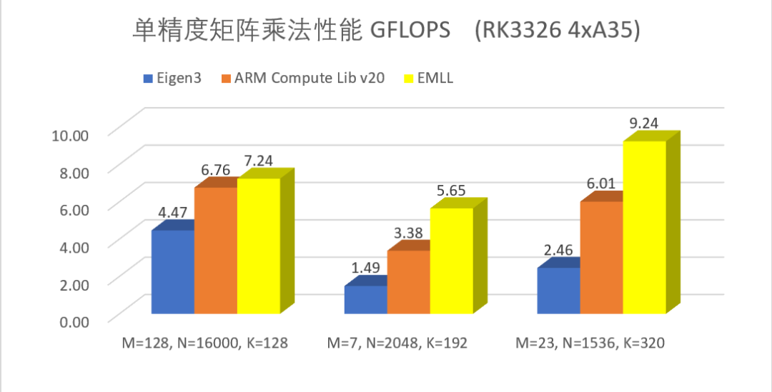 EMLL实现的矩阵乘法函数,为端侧人工智能中常见的扁平矩阵的计算做了专门的优化,为各常见ARM处理器做了特定的优化。对于cortex-A7/A35/A53/A55/A76处理器,本库根据它们的流水线特点,使用了汇编级别的优化。