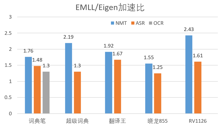 图3 端侧NMT、ASR、OCR在不同平台上使用EMLL和eigen端到端性能加速比