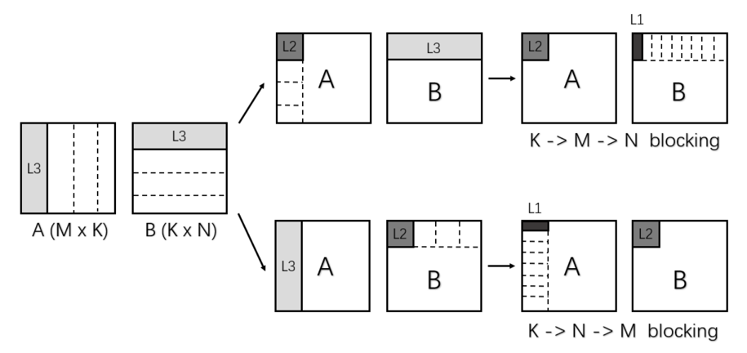 矩阵乘法的计算过程中需要频繁地访存。当矩阵规模较大时,CPU 缓存容量不足以装下其全部内容,访存时就会频繁出现缓存缺失,降低程序效率。此时,EMLL 会对矩阵乘法问题进行必要的拆解,把较大的矩阵切分成小块的矩阵,这就是分块的手段。经过切分,每个子任务只计算一小块矩阵对结果的贡献,只会密集访问这个小块矩阵的区域,大大提高了缓存命中率。对于两个较大矩阵之间的乘法,EMLL 参照已有的优化工作[1],通过多级的分块,充分利用 CPU 多级缓存,主要采用如下两种切分方式: