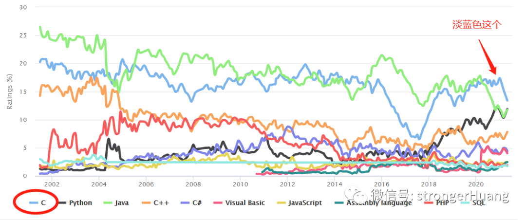 下面给你看下 C 语言这些年在编程语言中的排行情况: