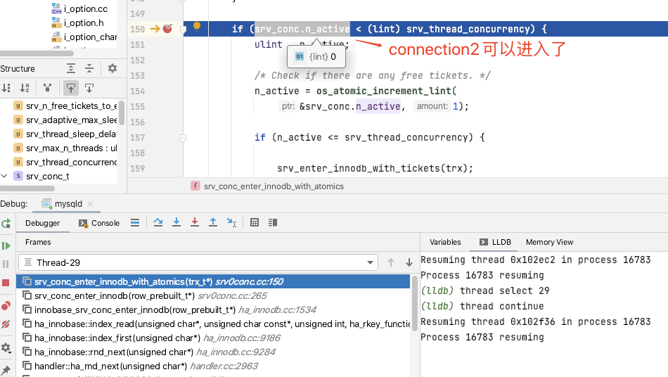 connection2也执行select,那么会发现connection2会卡在检查是否可以进入innodb。具体堆栈为: