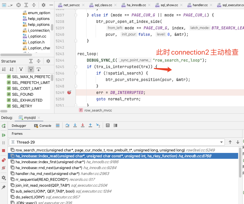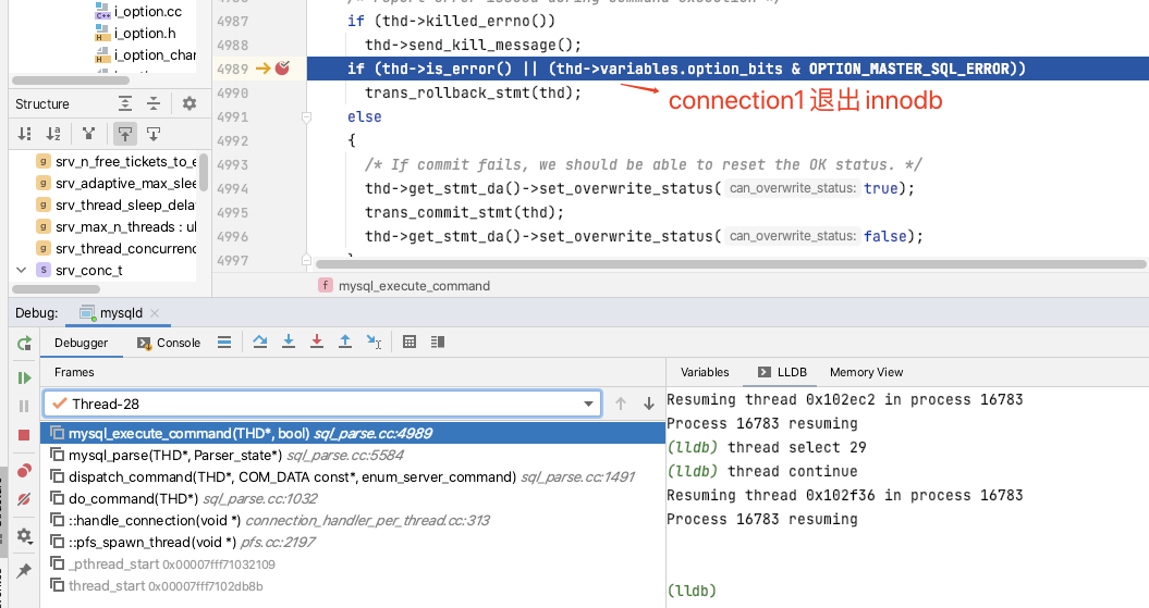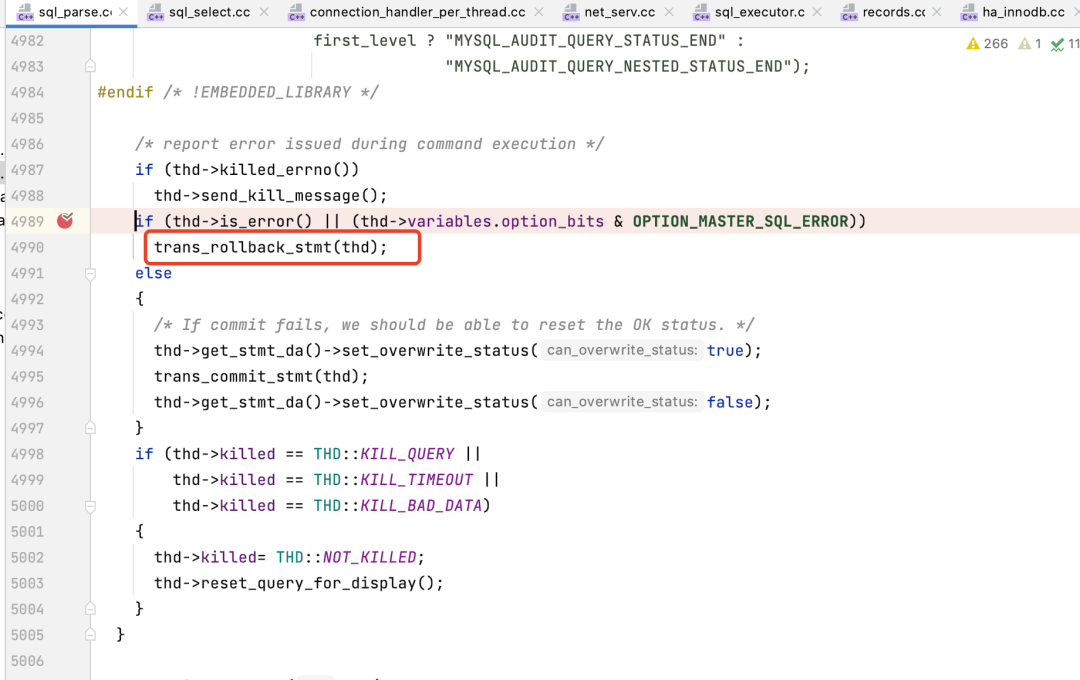 之后一层层返回错误,在sql_parse中会执行trans_rollback_stmt执行回滚操作。最后在handle_connection中检查到connection需要被关闭。