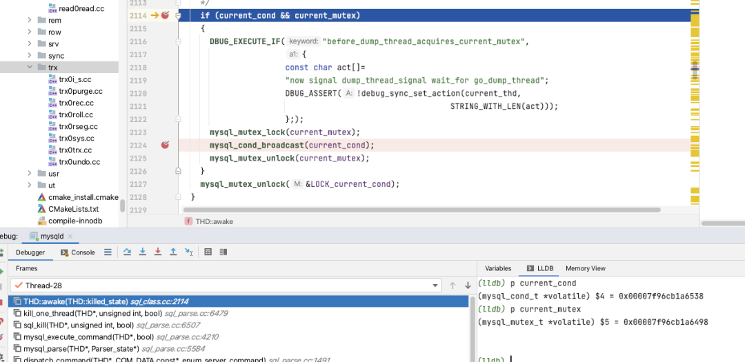 * frame #0: 0x00000001068a8853 mysqld`THD::awake(this=0x00007fbede88b400, state_to_set=KILL_CONNECTION) at sql_class.cc:2029:27frame #1: 0x000000010695961f mysqld`kill_one_thread(thd=0x00007fbed6bc9c00, id=2, only_kill_query=false) at sql_parse.cc:6479:14frame #2: 0x0000000106946529 mysqld`sql_kill(thd=0x00007fbed6bc9c00, id=2, only_kill_query=false) at sql_parse.cc:6507:16frame #3: 0x000000010694e0fa mysqld`mysql_execute_command(thd=0x00007fbed6bc9c00, first_level=true) at sql_parse.cc:4210:5frame #4: 0x0000000106945d62 mysqld`mysql_parse(thd=0x00007fbed6bc9c00, parser_state=0x000070000de2f340) at sql_parse.cc:5584:20frame #5: 0x0000000106942bf0 mysqld`dispatch_command(thd=0x00007fbed6bc9c00, com_data=0x000070000de2fe78, command=COM_QUERY) at sql_parse.cc:1491:5frame #6: 0x0000000106944e70 mysqld`do_command(thd=0x00007fbed6bc9c00) at sql_parse.cc:1032:17 frame #7: 0x0000000106ad3976 mysqld`::handle_connection(arg=0x00007fbee220b8d0) atconnection_handler_per_thread.cc:313:13frame #8: 0x000000010749e74c mysqld`::pfs_spawn_thread(arg=0x00007fbee15dcf90) at pfs.cc:2197:3 frame #9: 0x00007fff734b6109 libsystem_pthread.dylib`_pthread_start + 148frame #10: 0x00007fff734b1b8b libsystem_pthread.dylib`thread_start + 15