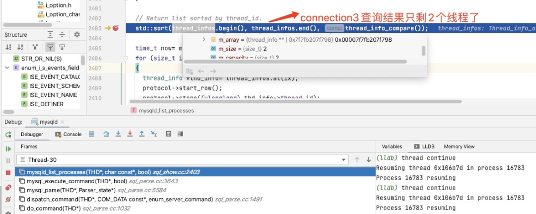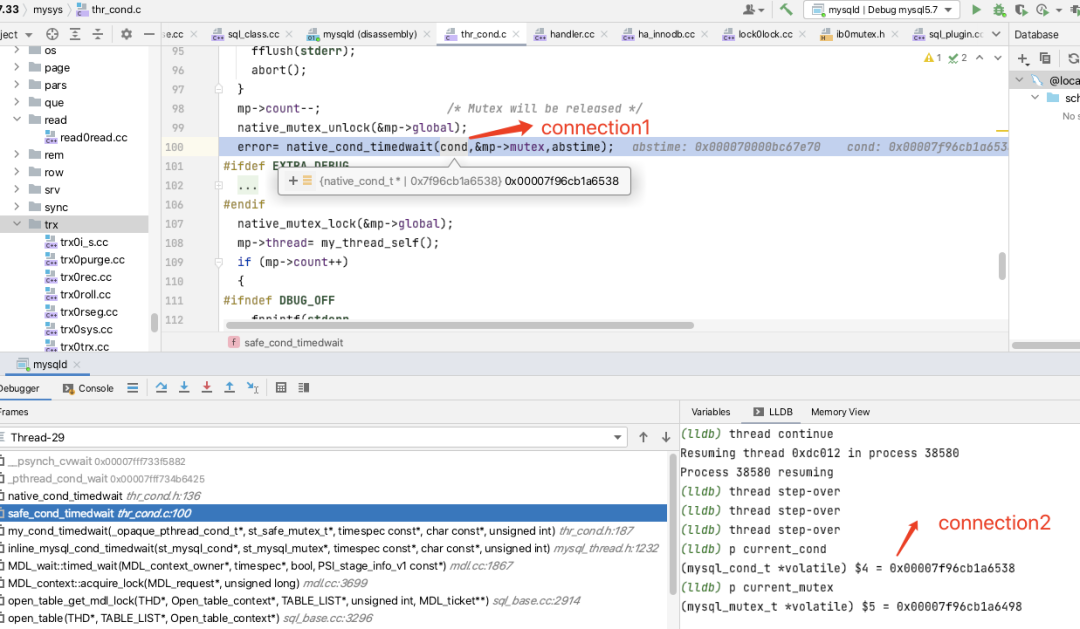 开启connection2,去kill connection1,执行到awake时,可以看到要唤醒的条件变量和 connection1在等待的是同一个对象。(0x00007f96cb1a6538)
