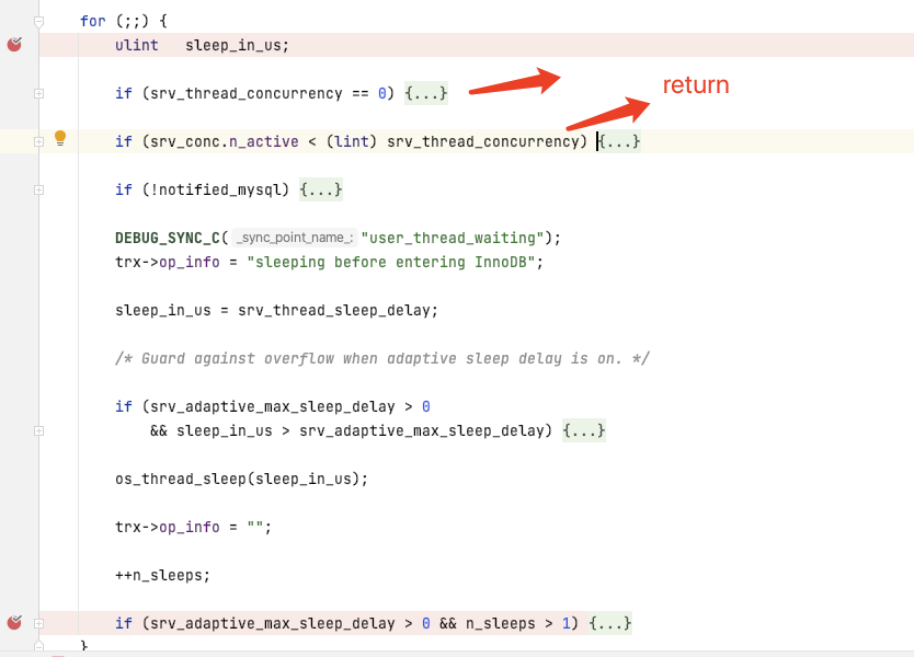 另外MySQL中innodb_thread_concurrency会限制进入innodb的线程并发度。那么当进入innodb层的线程达到阈值后,后面重建的大量连接会在mysql层执行for循环判断是否可以进入innodb。但是这个过程是没有检查killed状态的,导致这些线程一直无法被kill(尽管show processlist显示为Killed)。除非innodb里一个线程退出,使得某个线程可以进入innodb,从而执行代码到主动检查处或被唤醒执行kill逻辑。