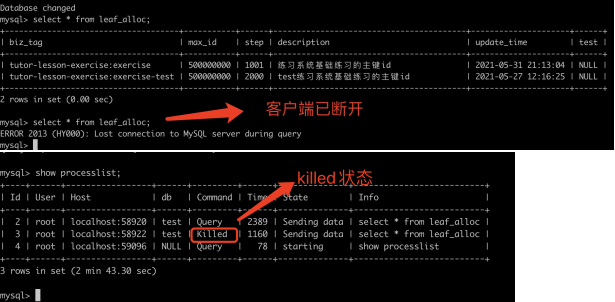 再开启一个connection3, 去kill connection2,可以发现connection2会一直处于killed状态(客户端会断开连接)