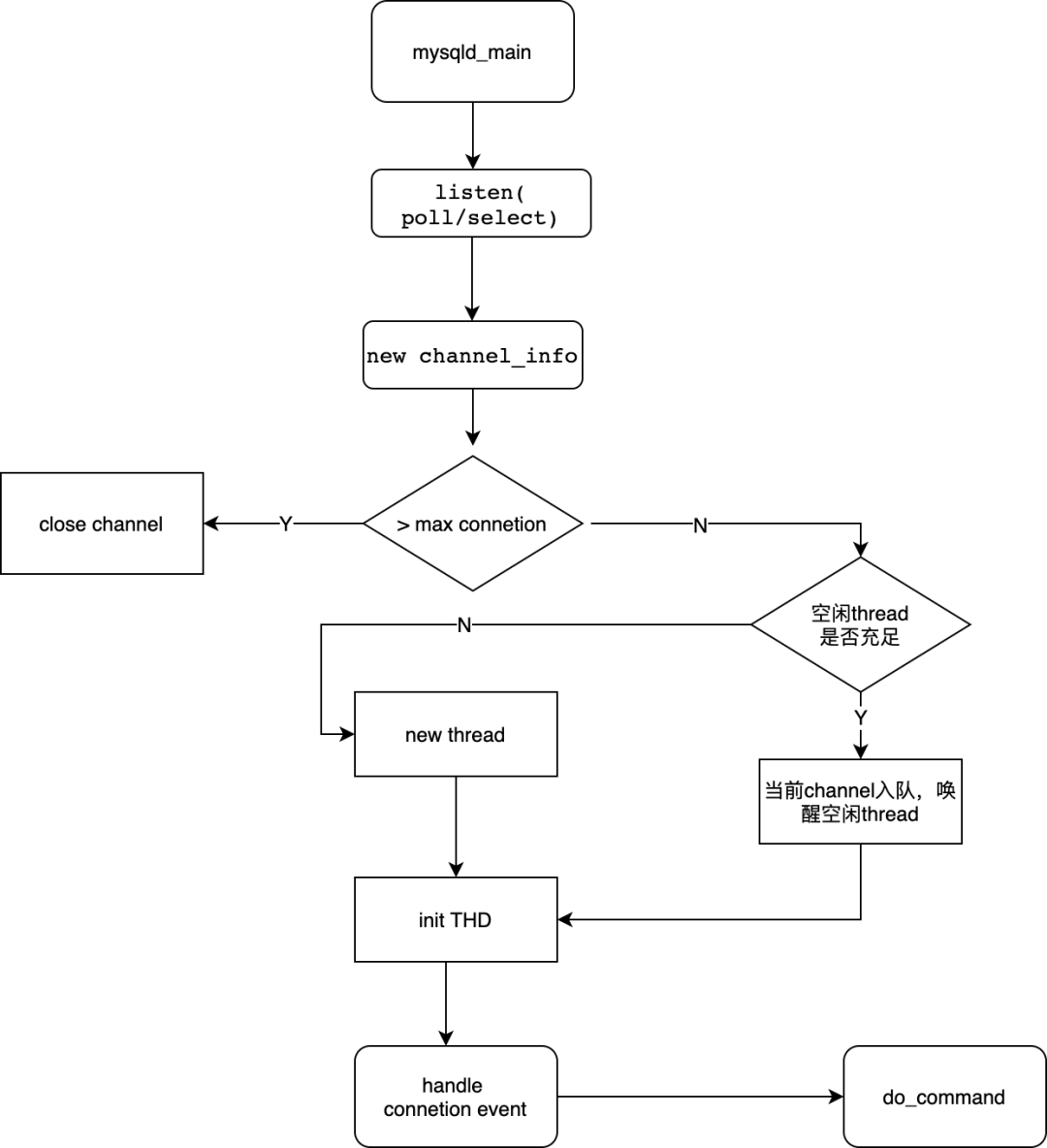 MySQL的启动入口函数为mysqld中的main函数,主要流程会启动一个线程去listen端口,accept tcp连接,并创建一个connection并与具体的线程绑定,去处理来自客户端的消息。