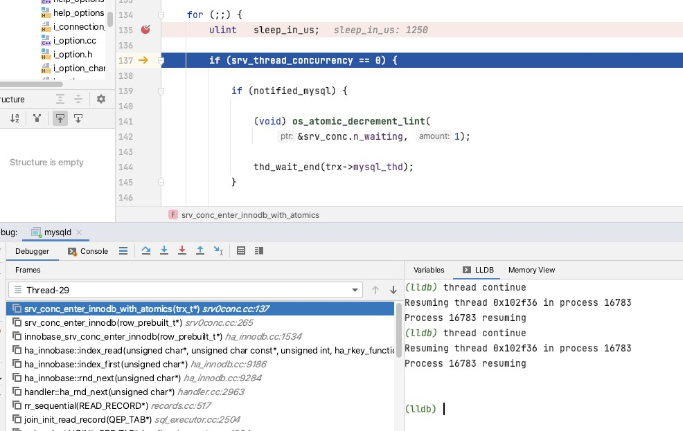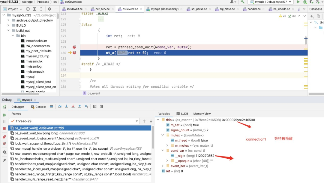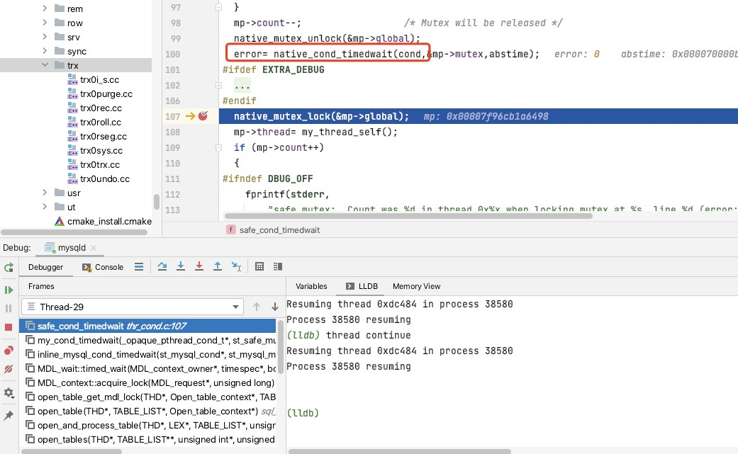thread #29frame #0: 0x00007fff733f5882 libsystem_kernel.dylib` psynch_cvwait + 10frame #1: 0x00007fff734b6425 libsystem_pthread.dylib`_pthread_cond_wait + 698 frame #2: 0x000000010ef6d495 mysqld`native_cond_timedwait(cond=0x00007f96cb1a6538,mutex=0x00007f96cb1a64d8, abstime=0x000070000bc67e70) at thr_cond.h:136:10frame #3: 0x000000010ef6d37a mysqld`safe_cond_timedwait(cond=0x00007f96cb1a6538, mp=0x00007f96cb1a6498, abstime=0x000070000bc67e70, file="/Users/zhaoxiaojie/CLionProjects/mysql-5.7.33/sql/mdl.cc", line=1868) at thr_cond.c:100:10frame #4: 0x000000010ea69955 mysqld`my_cond_timedwait(cond=0x00007f96cb1a6538, mp=0x00007f96cb1a6498, abstime=0x000070000bc67e70, file="/Users/zhaoxiaojie/CLionProjects/mysql-5.7.33/sql/mdl.cc", line=1868) at thr_cond.h:187:10frame #5: 0x000000010ea63341 mysqld`inline_mysql_cond_timedwait(that=0x00007f96cb1a6538, mutex=0x00007f96cb1a6498, abstime=0x000070000bc67e70, src_file="/Users/zhaoxiaojie/CLionProjects/mysql-5.7.33/sql/mdl.cc", src_line=1868) at mysql_thread.h:1232:13frame #6: 0x000000010ea631f8 mysqld`MDL_wait::timed_wait(this=0x00007f96cb1a6498, owner=0x00007f96cb1a6400, abs_timeout=0x000070000bc67e70, set_status_on_timeout=true, wait_state_name=0x00000001100b4b58) at mdl.cc:1867: 18frame #7: 0x000000010ea660e5 mysqld`MDL_context::acquire_lock(this=0x00007f96cb1a6498, mdl_request=0x00007f96cb0e71a0, lock_wait_timeout=31536000) at mdl.cc:3699:25frame #8: 0x000000010eb8a090 mysqld`open_table_get_mdl_lock(thd=0x00007f96cb1a6400, ot_ctx=0x000070000bc689a0, table_list=0x00007f96cb0e6e00, flags=0, mdl_ticket=0x000070000bc68318) at sql_base. cc:2914:35frame #9: 0x000000010eb885ec mysqld`open_table(thd=0x00007f96cb1a6400, table_list=0x00007f96cb0e6e00, ot_ctx=0x000070000bc689a0) at sql_base.cc:3296:9frame #10: 0x000000010eb8e77b mysqld`open_and_process_table(thd=0x00007f96cb1a6400, lex=0x00007f96cb1a8858, tables=0x00007f96cb0e6e00, counter=0x00007f96cb1a8918, flags=0, prelocking_strategy=0x000070000bc68ab8, has_prelocking_list=false, ot_ctx=0x000070000bc689a0) at sql_base.cc:5260:14frame #11: 0x000000010eb8d8dc mysqld`open_tables(thd=0x00007f96cb1a6400, start=0x000070000bc68ac8, counter=0x00007f96cb1a8918, flags=0, prelocking_strategy=0x000070000bc68ab8) at sql_base.cc:5883:14frame #12: 0x000000010eb90c6d mysqld`open_tables_for_query(thd=0x00007f96cb1a6400, tables=0x00007f96cb0e6e00, flags=0) at sql_base.cc:6660:7frame #13: 0x000000010ed48b0c mysqld`Sql_cmd_update::try_single_table_update(this=0x00007f96cb0e6dc8, thd=0x00007f96cb1a6400, switch_to_multitable=0x000070000bc68c07) at sql_update.cc:2911:7frame #14: 0x000000010ed49457 mysqld`Sql_cmd_update::execute(this=0x00007f96cb0e6dc8, thd=0x00007f96cb1a6400) at sql_update.cc:3058:7frame #15: 0x000000010ec57475 mysqld`mysql_execute_command(thd=0x00007f96cb1a6400, first_level=true) at sql_parse.cc:3616:26frame #16: 0x000000010ec51d62 mysqld`mysql_parse(thd=0x00007f96cb1a6400, parser_state=0x000070000bc6c340) at sql_parse.cc:5584:20frame #17: 0x000000010ec4ebf0 mysqld`dispatch_command(thd=0x00007f96cb1a6400, com_data=0x000070000bc6ce78, command=COM_QUERY) at sql_parse.cc:1491:5frame #18: 0x000000010ec50e70 mysqld`do_command(thd=0x00007f96cb1a6400) at sql_parse.cc:1032:17 frame #19: 0x000000010eddf976 mysqld`::handle_connection(arg=0x00007f96cfe2e1b0) at