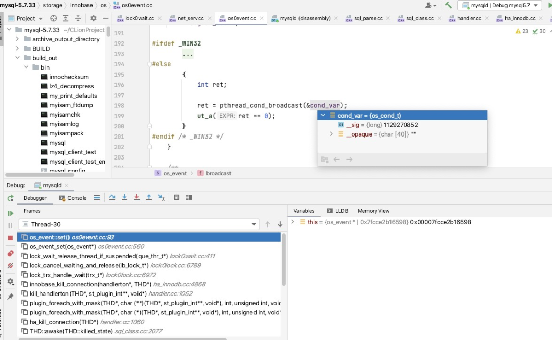 thread #30frame #0: 0x00000001060f910e mysqld`os_event::set(this=0x00007fcce2b16598) at os0event.cc:93:2 frame #1: 0x00000001060f90b5 mysqld`os_event_set(event=0x00007fcce2b16598) at os0event.cc:560:9frame #2: 0x00000001060aa06e mysqld`lock_wait_release_thread_if_suspended(thr=0x00007fccd90936f0) at lock0wait.cc:411:3frame #3: 0x0000000106089a99 mysqld`lock_cancel_waiting_and_release(lock=0x00007fccd8866c18) at lock0lock. cc:6789:3frame #4: 0x0000000106096679 mysqld`lock_trx_handle_wait(trx=0x00007fcce1cc0ce0) at lock0lock.cc:6972:3 frame #5: 0x0000000105ff93a6 mysqld`innobase_kill_connection(hton=0x00007fccd7e094d0,thd=0x00007fcce585f400) at ha_innodb.cc:4868:3frame #6: 0x0000000104fdcb96 mysqld`kill_handlerton(thd=0x00007fcce585f400, plugin=0x0000700009f809d8, (null)=0x0000000000000000) at handler.cc:1052:7frame #7: 0x00000001058d659c mysqld`plugin_foreach_with_mask(thd=0x00007fcce585f400, funcs=0x0000700009f80a60, type=1, state_mask=4294967287, arg=0x0000000000000000)(THD*, st_plugin_int**, void*), int, unsigned int, void*) at sql_plugin.cc:2524:21frame #8: 0x00000001058d66a2 mysqld`plugin_foreach_with_mask(thd=0x00007fcce585f400, func= (mysqld`kill_handlerton(THD*, st_plugin_int**, void*) at handler.cc:1046), type=1, state_mask=8, arg=0x0000000000000000)(THD*, st_plugin_int**, void*), int, unsigned int, void*) at sql_plugin.cc:2539:10frame #9: 0x0000000104fdcb1b mysqld`ha_kill_connection(thd=0x00007fcce585f400) at handler.cc:1060:3frame #10: 0x00000001057f8923 mysqld`THD::awake(this=0x00007fcce585f400, state_to_set=KILL_CONNECTION) at sql_class.cc:2077:5frame #11: 0x00000001058a961f mysqld`kill_one_thread(thd=0x00007fccd8b9ea00, id=3, only_kill_query=false) at sql_parse.cc:6479:14frame #12: 0x0000000105896529 mysqld`sql_kill(thd=0x00007fccd8b9ea00, id=3, only_kill_query=false) at sql_parse.cc:6507:16frame #13: 0x000000010589e0fa mysqld`mysql_execute_command(thd=0x00007fccd8b9ea00, first_level=true) at sql_parse.cc:4210:5frame #14: 0x0000000105895d62 mysqld`mysql_parse(thd=0x00007fccd8b9ea00, parser_state=0x0000700009f84340) at sql_parse.cc:5584:20frame #15: 0x0000000105892bf0 mysqld`dispatch_command(thd=0x00007fccd8b9ea00, com_data=0x0000700009f84e78, command=COM_QUERY) at sql_parse.cc:1491:5frame #16: 0x0000000105894e70 mysqld`do_command(thd=0x00007fccd8b9ea00) at sql_parse.cc:1032:17