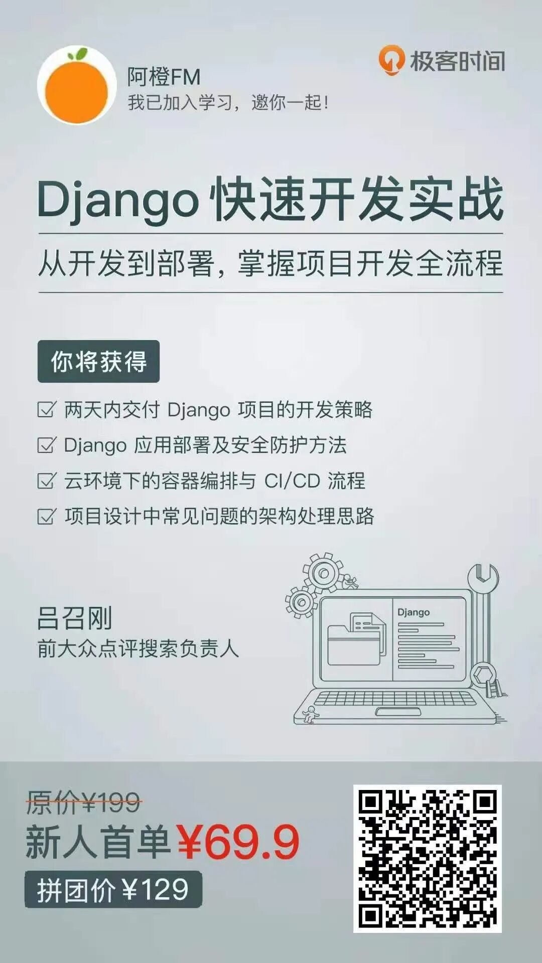 在课程中,他不仅讲解了 Django 应用部署及安全防护方法、云环境下的容器编排与 CI/CD 流程,还梳理出项目设计中常见问题的架构处理思路,以及两天内交付 Django 项目的开发策略——通过几个实战项目,将一个复杂的产品拆解成不同模块,由浅入深迭代,直到完成一个完整的产品开发,在实战中带你学习 Django 开发的相关技能。