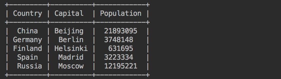 table.field_names = ['Country', 'Capital', 'Population']