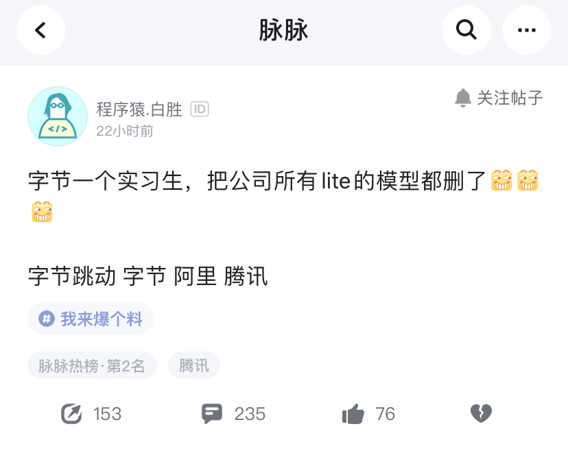昨晚脉脉上有网友爆料,字节跳动一位实习生删除了公司所有轻量级别的机器学习模型