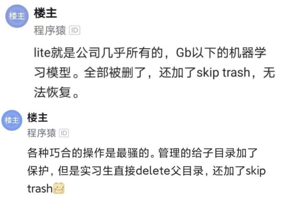 该楼主表示,lite模型就是公司内几乎所有GB大小以下的机器学习模型,且全部被删除了,实习生直接删除的是父目录且加了 skip trash (删除文件时临时禁用回收)操作,导致被删除模型无法被恢复。当晚全公司通报,直接被列入 P0 事故等级(严重事故):据楼层讨论,光是处理问题的群就进了接近三百人,其殃及业务之广可想而知:大家都在讨论这位实习生的去留,我们搜了一下,据说,“只要不是主观故意的”就不会被开除:网友热议
