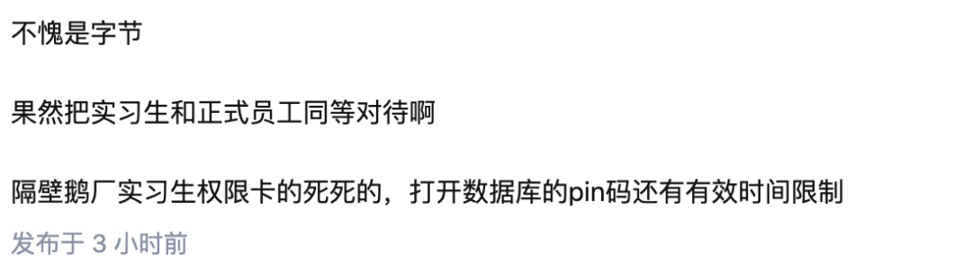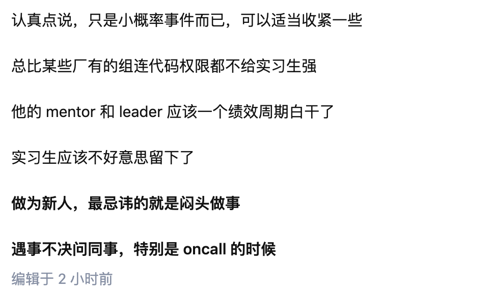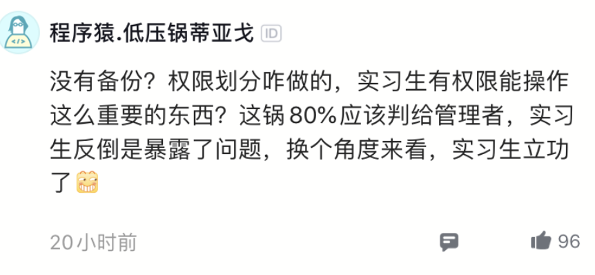 有网友表示这是实习生给你们这帮人出了一道hard题,不过没有标准答案,考验你们解题能力的时候到了。还有网友表示实习生不能有权限操作这么重要的东西,这锅80%应该判给管理者,实习生反倒是暴露了问题,换个角度来看,实习生立功了。我们知道,字节跳动最出名的文化之一,就是扁平化管理。实习生与正式员工有同样的文档权限,这也是字节能够在与BAT等大厂竞争中保持灵活高效的秘诀,从这个角度上来说,说实习生立功倒也不能算错。