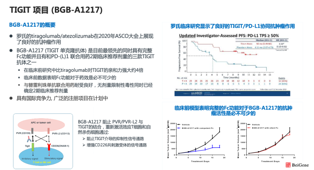 Ociperlimab(BGB-A1217)是一款在研人源化 IgG 1 单克隆抗体,由百济神州自主研发并在全球范围内进行开发。作为一款免疫检查点候选药物,ociperlimab 是当前开发进程中最先进的抗 TIGIT 抗体之一,具有完整的 Fc 功能。据百济此前投资者会议中的披露信息,ociperlimab 在临床前研究中表现出较罗氏同靶点单抗 Tiragolumab 强约 4 倍的亲和力。