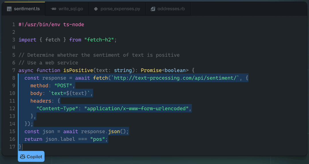 令人期待的是,Copilot不仅仅是模仿以前见过的代码,而且还会分析文档中的字符串、注释、函数名称以及代码本身,从而生成新的匹配代码,包括之前调用的特定函数。