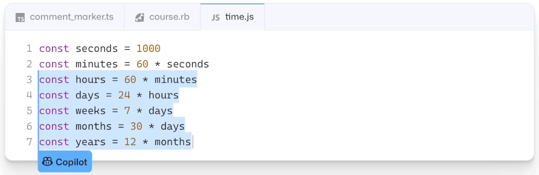 Copilot可以快速生成重复代码, 只需列举几个例子,剩下的就可以交给它了。