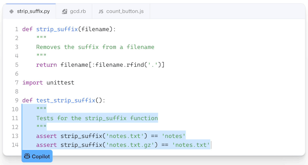 此外,Copilot将支持多种编程语言:Python、JavaScript、TypeScript、Ruby和Go。