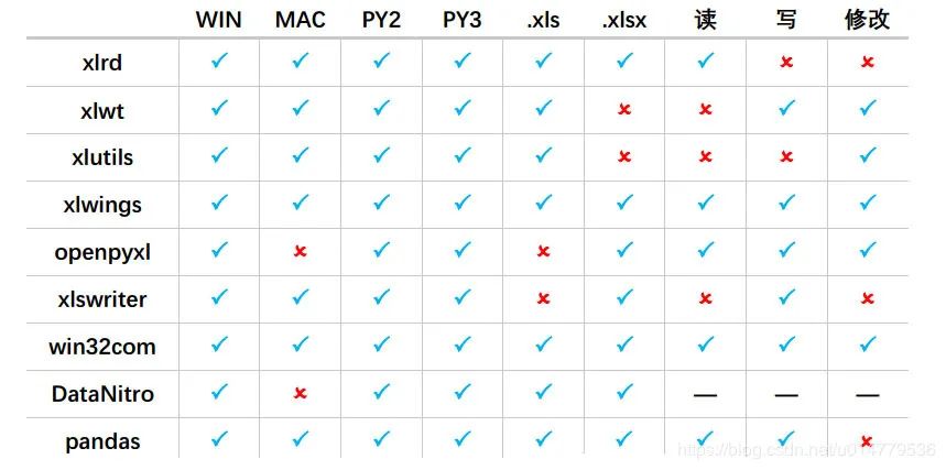 https://blog.csdn.net/u014779536/article/details/108182833 0 Python Excel库对比 我们先来看一下python中能操作Excel的库对比(一共九个库):