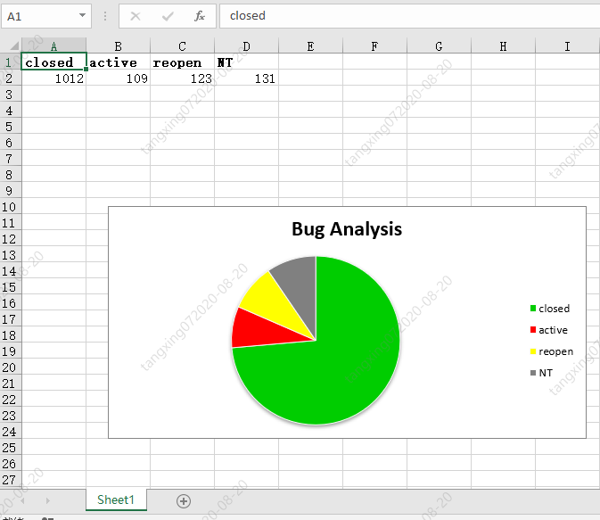 # -*- coding:utf-8 -*- import xlsxwriter# 创建一个excel workbook = xlsxwriter.Workbook("chart_pie.xlsx" )# 创建一个sheet worksheet = workbook.add_worksheet()# 自定义样式,加粗 bold = workbook.add_format({'bold' : 1 })# --------1、准备数据并写入excel--------------- # 向excel中写入数据,建立图标时要用到 data = [ ['closed' , 'active' , 'reopen' , 'NT' ], [1012 , 109 , 123 , 131 ], ]# 写入数据 worksheet.write_row('A1' , data[0 ], bold) worksheet.write_row('A2' , data[1 ])# --------2、生成图表并插入到excel--------------- # 创建一个柱状图(pie chart) chart_col = workbook.add_chart({'type'