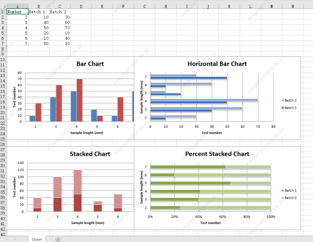 , 20 , 10 ), (6 , 10 , 40 ), (7 , 50 , 30 ), ]for row in rows: ws.append(row) chart1 = BarChart() chart1.type = "col" chart1.style = 10 chart1.title = "Bar Chart" chart1.y_axis.title = 'Test number' chart1.x_axis.title = 'Sample length (mm)' data = Reference(ws, min_col=2 , min_row=1 , max_row=7 , max_col=3 ) cats = Reference(ws, min_col=1 , min_row=2 , max_row=7 ) chart1.add_data(data, titles_from_data=True ) chart1.set_categories(cats) chart1.shape = 4 ws.add_chart(chart1, "A10" )from copy import deepcopy chart2 = deepcopy(chart1) chart2.style = 11 chart2.type = "bar" chart2.title = "Horizontal Bar Chart" ws.add_chart(chart2, "G10" ) chart3 = deepcopy(chart1) chart3.type = "col" chart3.style = 12 chart3.grouping = "stacked" chart3.overlap = 100 chart3.title = 'Stacked Chart' ws.add_chart(chart3, "A27" )