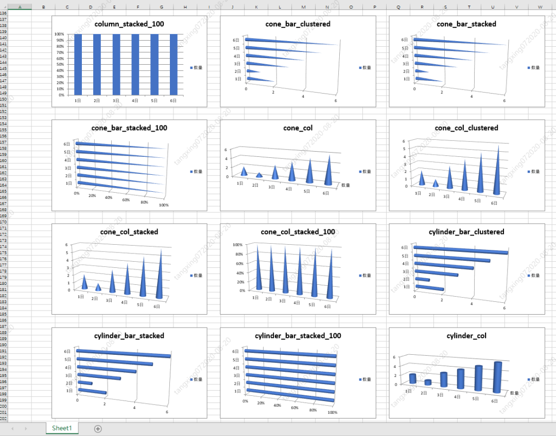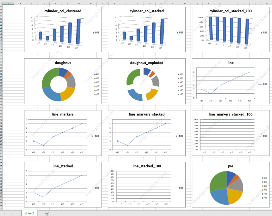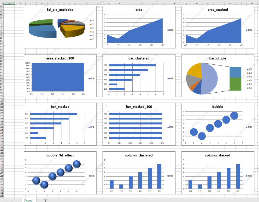 ).value = [['时间' , '数量' ], ['1日' , 2 ], ['2日' , 1 ], ['3日' , 3 ] , ['4日' , 4 ], ['5日' , 5 ], ['6日' , 6 ]]"""图表类型参数,被注释的那几个,无法生成对应的图表""" dic = { '3d_area' : -4098 , '3d_area_stacked' : 78 , '3d_area_stacked_100' : 79 , '3d_bar_clustered' : 60 , '3d_bar_stacked' : 61 , '3d_bar_stacked_100' : 62 , '3d_column' : -4100 , '3d_column_clustered' : 54 , '3d_column_stacked' : 55 , '3d_column_stacked_100' : 56 , '3d_line' : -4101 , '3d_pie' : -4102 , '3d_pie_exploded' : 70 , 'area' : 1 , 'area_stacked' : 76 , 'area_stacked_100' : 77 , 'bar_clustered' : 57 , 'bar_of_pie'