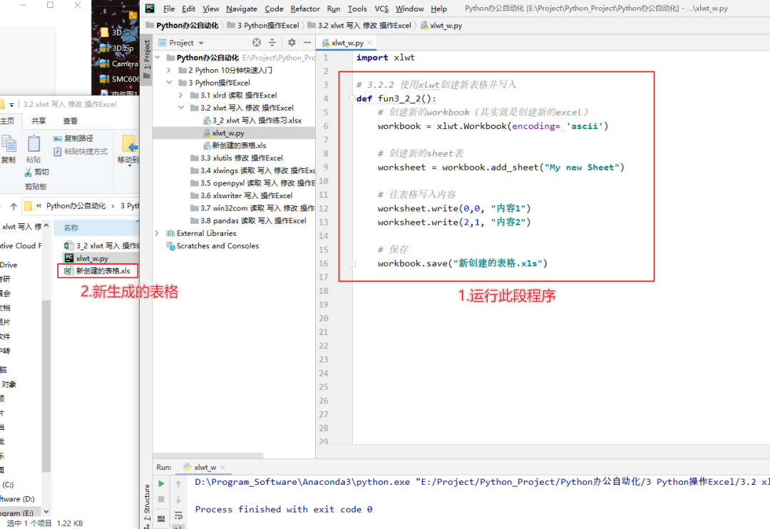 # 3.2.2 使用xlwt创建新表格并写入 def fun3_2_2 () : # 创建新的workbook(其实就是创建新的excel) workbook = xlwt.Workbook(encoding= 'ascii' ) # 创建新的sheet表 worksheet = workbook.add_sheet("My new Sheet" ) # 往表格写入内容 worksheet.write(0 ,0 , "内容1" ) worksheet.write(2 ,1 , "内容2" ) # 保存 workbook.save("新创建的表格.xls" )