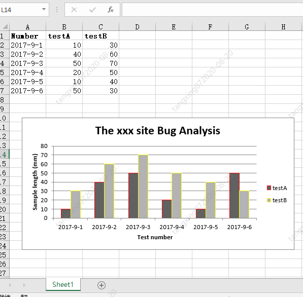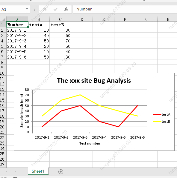 , 'values' : '=Sheet1!$C$2:$C$7' , 'line' : {'color' : 'yellow' }, })# 配置第二个系列数据(用了另一种语法) # chart_col.add_series({ # 'name': ['Sheet1', 0, 2], # 'categories': ['Sheet1', 1, 0, 6, 0], # 'values': ['Sheet1', 1, 2, 6, 2], # 'line': {'color': 'yellow'}, # }) # 设置图表的title 和 x,y轴信息 chart_col.set_title({'name' : 'The xxx site Bug Analysis' }) chart_col.set_x_axis({'name' : 'Test number' }) chart_col.set_y_axis({'name' : 'Sample length (mm)' })# 设置图表的风格 chart_col.set_style(1 )# 把图表插入到worksheet并设置偏移 worksheet.insert_chart('A10' , chart_col, {'x_offset' : 25 , 'y_offset' : 10 }) workbook.close()