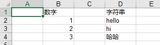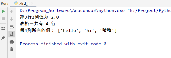 table = xlsx.sheet_by_index(0 )# 获取单个表格值 (2,1)表示获取第3行第2列单元格的值 value = table.cell_value(2 , 1 ) print("第3行2列值为" ,value)# 获取表格行数 nrows = table.nrows print("表格一共有" ,nrows,"行" )# 获取第4列所有值(列表生成式) name_list = [str(table.cell_value(i, 3 )) for i in range(1 , nrows)] print("第4列所有的值:" ,name_list)