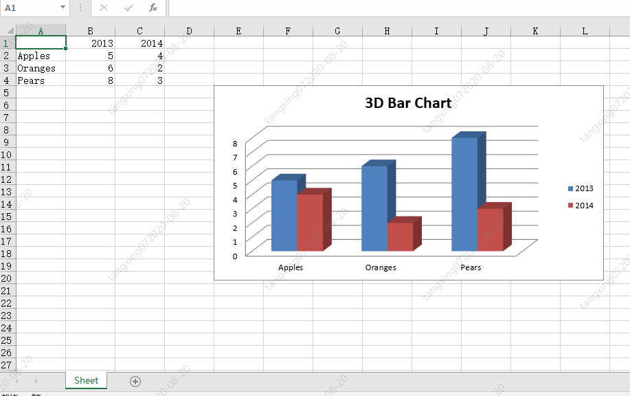 from openpyxl import Workbookfrom openpyxl.chart import ( Reference, Series, BarChart3D, ) wb = Workbook() ws = wb.active rows = [ (None , 2013 , 2014 ), ("Apples" , 5 , 4 ), ("Oranges" , 6 , 2 ), ("Pears" , 8 , 3 ) ]for row in rows: ws.append(row) data = Reference(ws, min_col=2 , min_row=1 , max_col=3 , max_row=4 ) titles = Reference(ws, min_col=1 , min_row=2 , max_row=4