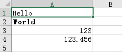 # 3.6.2 xlswriter新建并写入Excel def fun3_6_2 () : # 创建Exce并添加sheet workbook = xlsxwriter.Workbook('demo.xlsx' ) worksheet = workbook.add_worksheet() # 设置列宽 worksheet.set_column('A:A' , 20 ) # 设置格式 bold = workbook.add_format({'bold' : True }) # 添加文字内容 worksheet.write('A1' , 'Hello' ) # 按格式添加内容 worksheet.write('A2' , 'World' , bold) # 写一些数字 worksheet.write(2 , 0 , 123 ) worksheet.write(3 , 0 , 123.456 ) # 添加图片 worksheet.insert_image('B5' , 'demo.png' ) workbook.close()