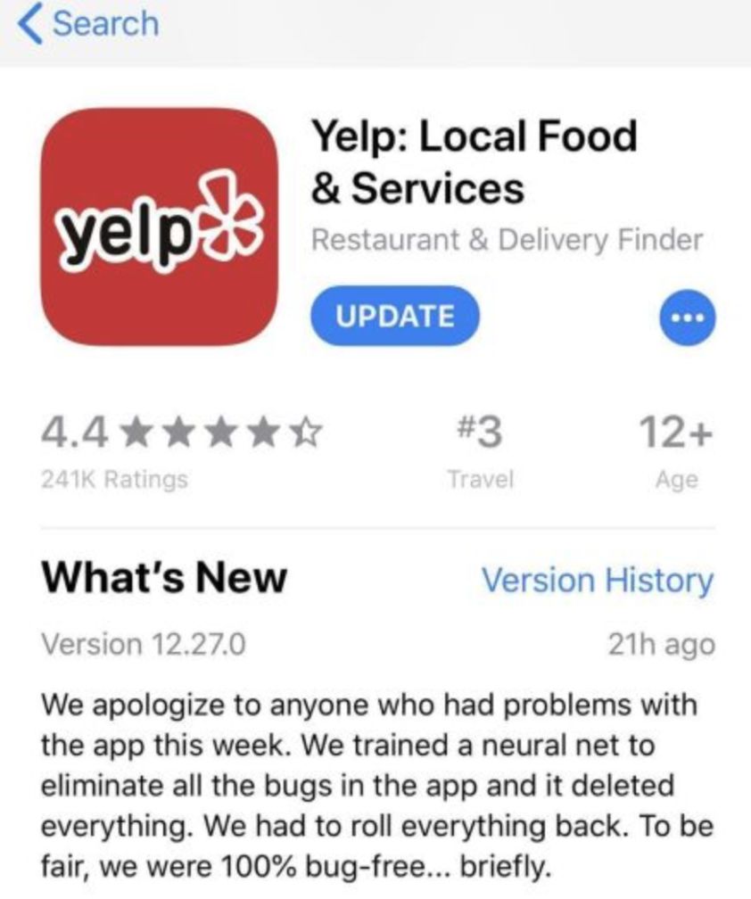 2019年,美国版大众点评Yelp训练了一个用来消除 bug 的神经网络,万万没想到,该网络删除一切,从根本上彻底了实现“bug-free”。