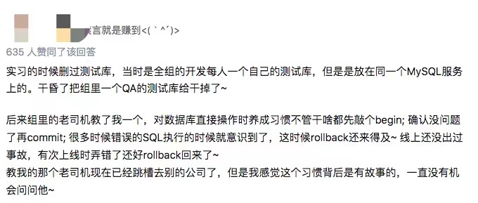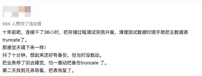 在话题「不小心删库是一种怎样的体验?」下,很多人都发表了当年的经历。多年前(2001年),那还是unix字符界面,半夜我例行维护,我删过一个包含二十万本图书的库…………十分钟后我确认我出错后,我开始冒汗,胃部像是被猛打了一拳开始痉挛,疼的我都坐不住。好一会我去过道抽了两根烟,才回忆起前天做了全系统备份,丢的数据不多!不过,如果此次字节lite 模型删除真的没影响线上,某种程度上,这还及时暴露了问题,甚至可能避免了以后更大的错误。https://www.zhihu.com/question/466656197https://www.zhihu.com/question/58802374