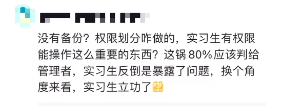但实际上,权限管理目录是个大学问,需要一套大流程。有人提议,这种情况后续权限控制,或者把skip trash弄掉,或者尽可能把权限拆分到各自的模型上。总之大部分网友认为,一个实习生不应该承担太多的责任!其实类似事情还有较为狗血的——2019年AI删库,程序员背锅!