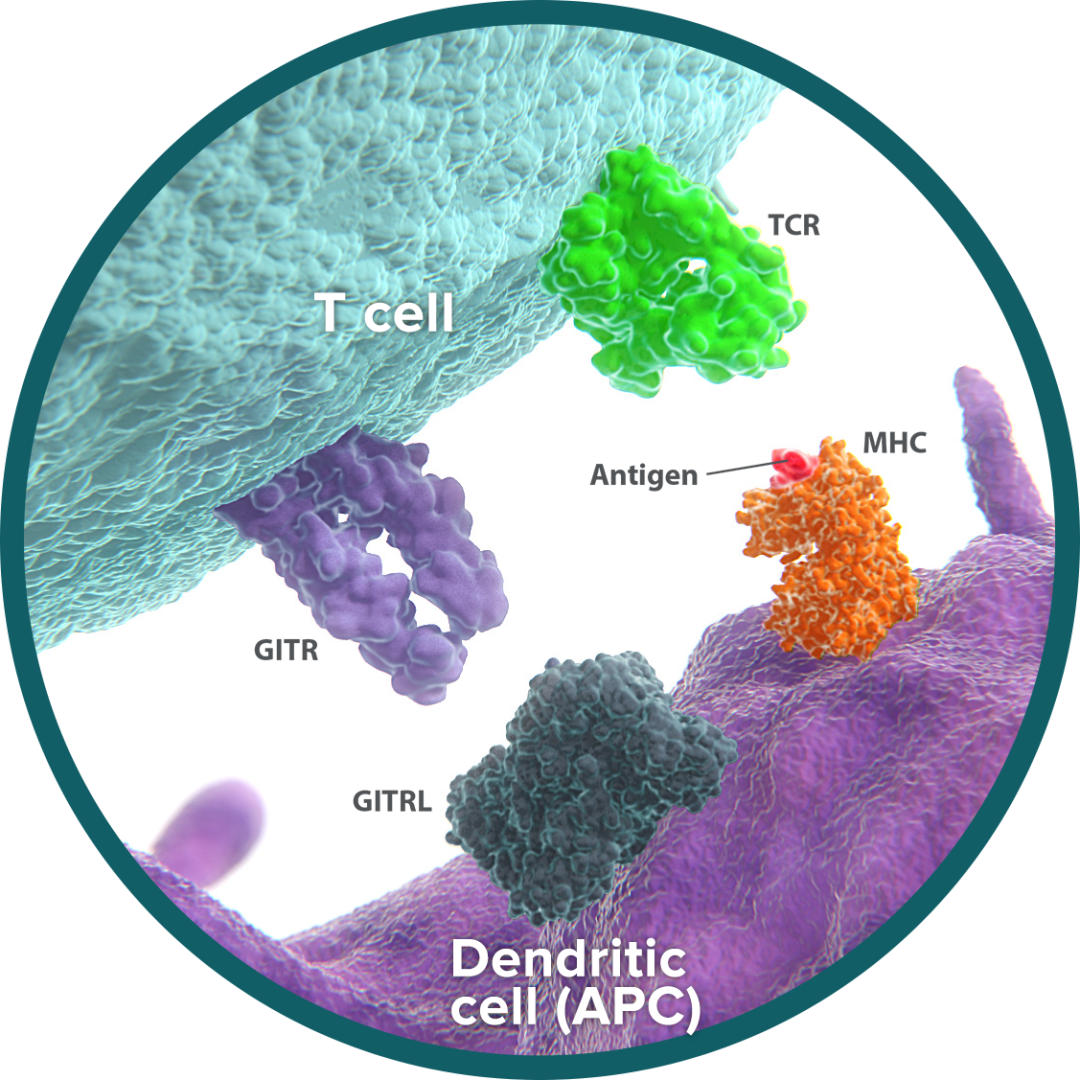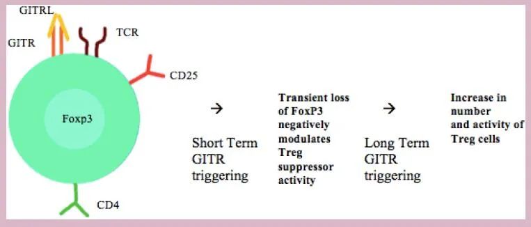 在外周,T细胞受体(TCR)刺激后,传统T细胞上的GITRL或激动剂抗体通过诱导白细胞介素(IL)-2和IFN-γ的表达,增强CD25的表达并刺激细胞增殖来增加T细胞的活化。此外,GITR共刺激增强CD8+T细胞的细胞毒作用,促进骨髓CD8+记忆T细胞存活。
